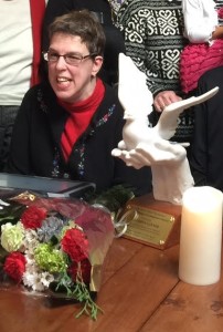 Abbey Chaplain, Dot Walsh presents award to Peace Activist Carol Coakley.