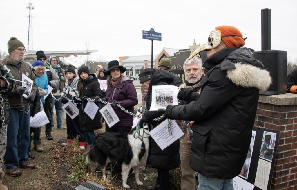 In Plymouth, a town that tells and retells the story of people fleeing oppression in search of refuge, a group of residents echoed that image during the Requiem Peace Chain Walk starting at the entrance to the Plymouth County ICE Detention Center. They carried a long chain, used for more than a quarter of a century by the Peace Abbey to denounce war and violence with messages of grievance, grief, and remembrance, as they crossed a familiar striped crosswalk, the kind found at intersections across America.