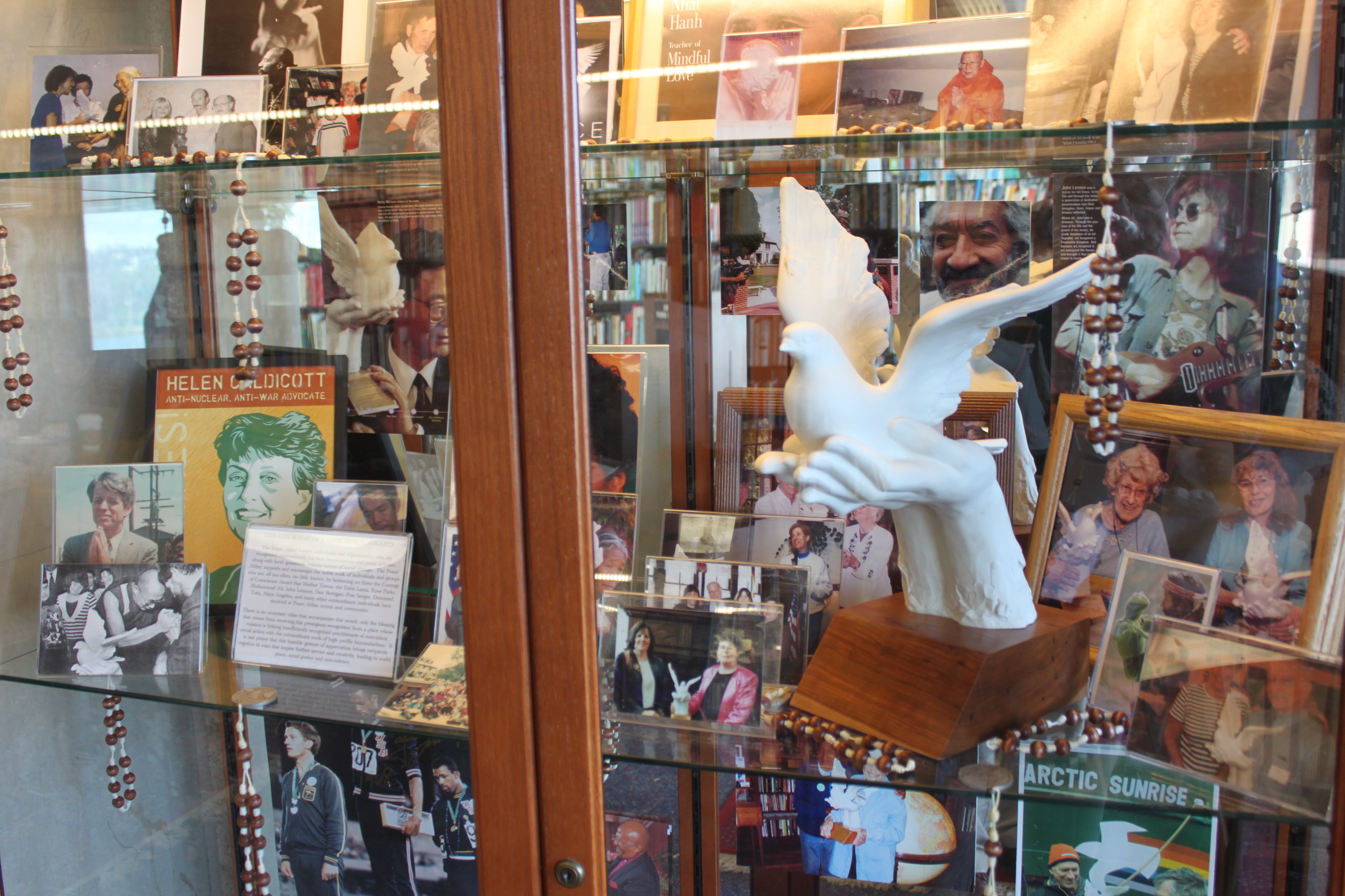 In June of 1992, the Peace Abbey collection was assembled to create the new UMASS Boston Peace Room with the entire archives from the Peace Abbey in Sherborn. Below are photos of the room with the extensive library and holdings gifted to the university. The collection is held at the Healey Library at UMB under the care of the Archives and Special Collections Department.